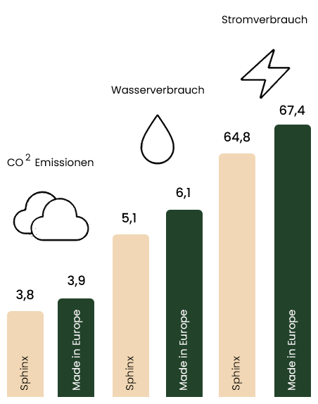 Das sind die Auswirkungen, die die Produktion einer unserer Sphinxs auf den Planeten hat im Vergleich zu einer 'Made un Eu - Unterwäsche". Natürlich tun wir alles, um diese Auswirkungen so gering wie möglich zu halten. Aber so, weißt Du Bescheid.